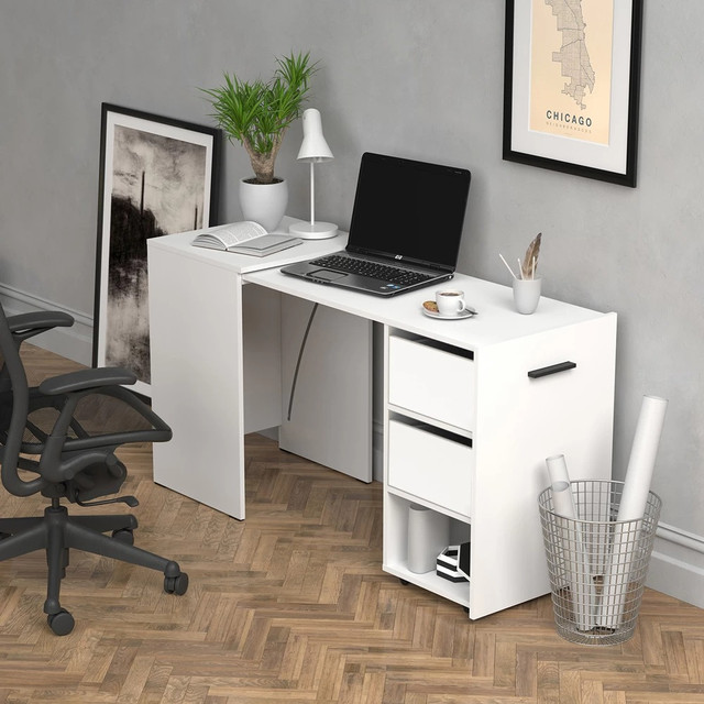 Однак конструкція не така проста, як здається з першого погляду. На тумбі є ручка, за яку потрібно потягнути на себе, щоб висунути приховану частину меблів. Це дає змогу збільшити довжину стільниці до 1400 мм, а також отримати три ящики для зберігання речей (відкритих або висувних закритих залежно від обраної комплектації).
