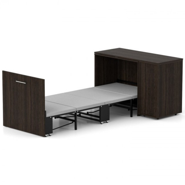 Розроблений для економії місця та зручності, він об'єднує в собі відразу 4 предмети меблів! У повністю складеному вигляді — це стильний комод із тумбою, що не займає багато місця в приміщенні. У розкладеному вигляді — це повноцінне односпальне ліжко розміром 2000х800 мм. у комплекті зі зручним матрацом, який за потреби легко зняти та замінити на будь-який інший. Якщо вам потрібен письмовий стіл, тоді досить просто повернути стільницю з тумбою на 90 градусів — зручне робоче місце готове! Сама тумбочка двостороння, тому ви з одного боку можете зберігати на полицях канцелярське приладдя, а з іншого боку — різні побутові речі.