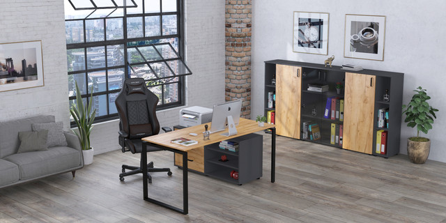 Вбудована тумба складається з двох секцій: висувних ящиків і відкритих полиць. Це дає змогу максимально ефективно організувати робочий простір, зберігаючи документи, канцелярію або інші важливі речі під рукою. Відкриті полиці ідеально підходять для декору, книг або оргтехніки.